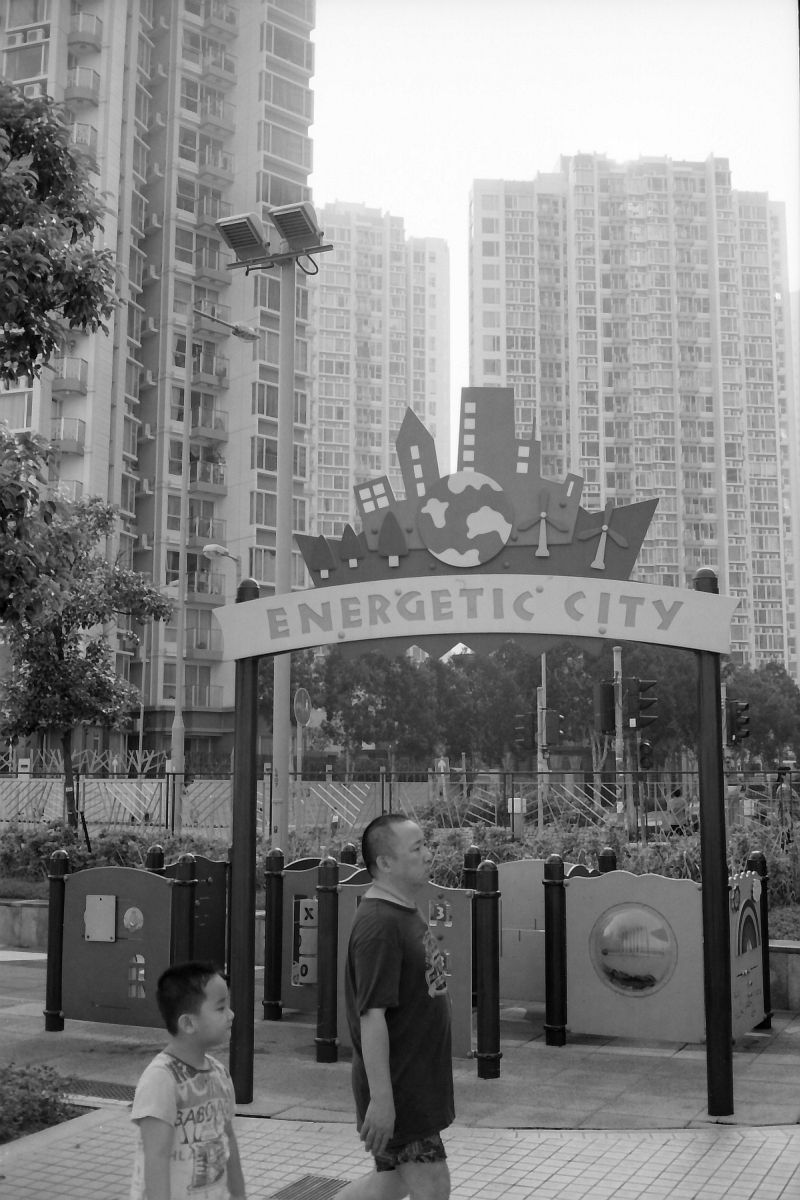 The city promises positive transformation even as the high rise buildings tower over and dominate its inhabitants. The deadpan expression of the father walking past the sign imparts the scene its irony, and the slightly suppressed hopeful countenance of the boy tells us he has yet to be properly socialised into a modern figure.
