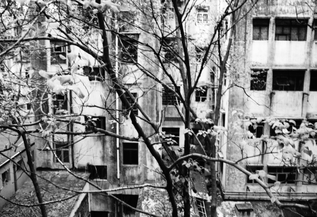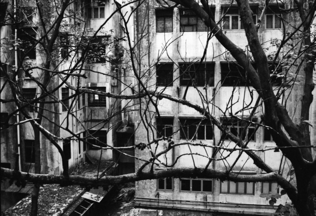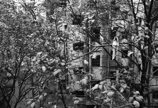 You could also see unruly leaves and branches against grey concrete buildings.
